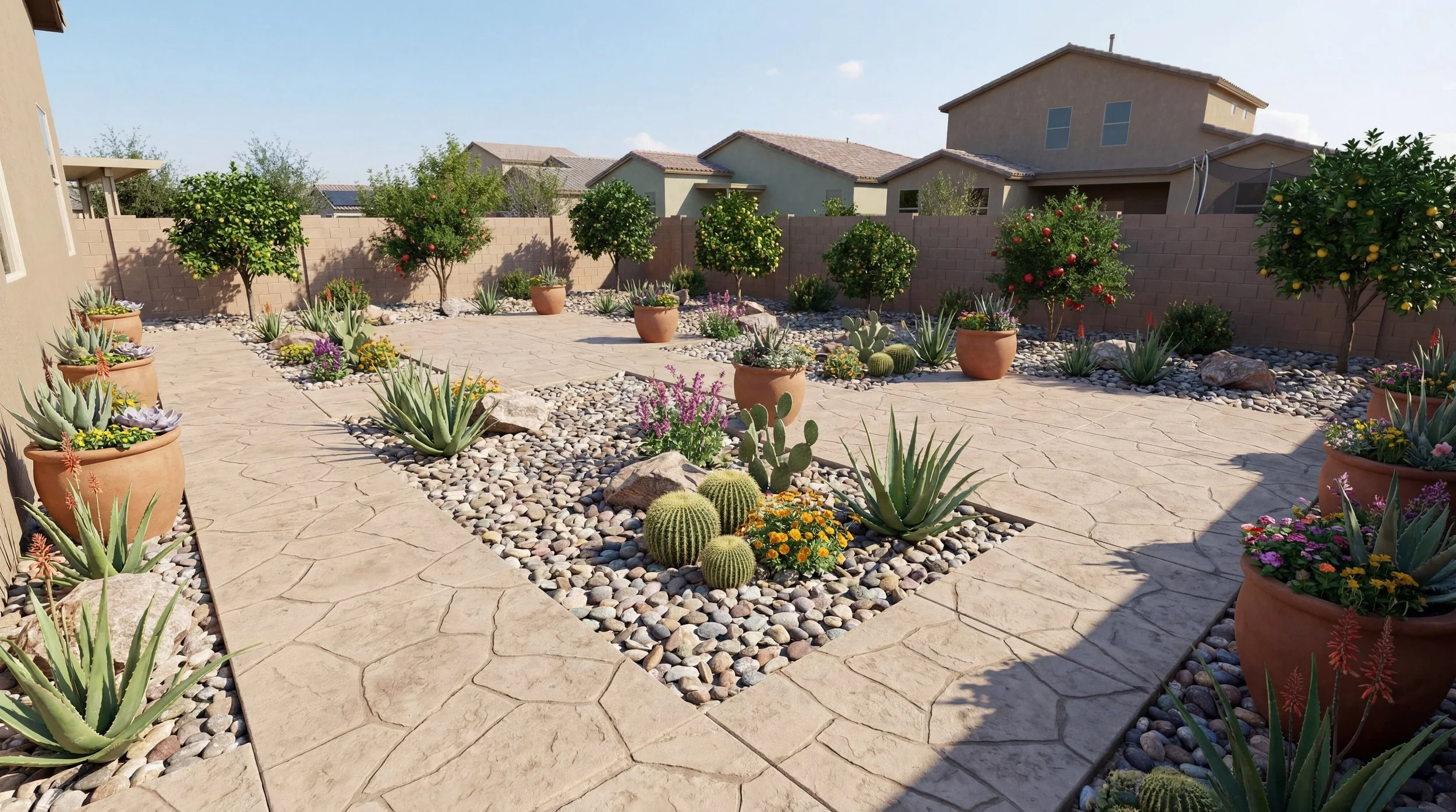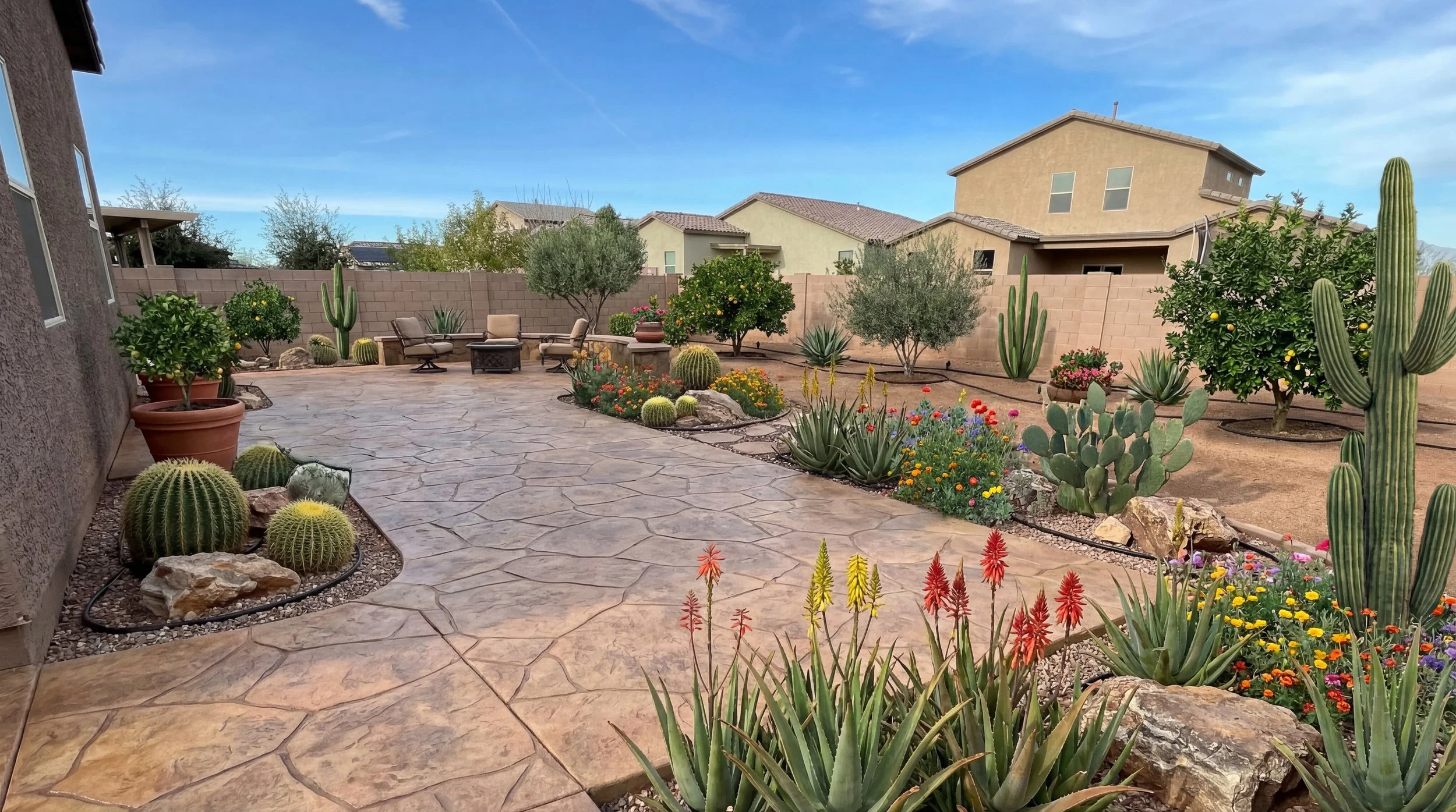 Stamped Concrete with Half Wall and Fruit Trees